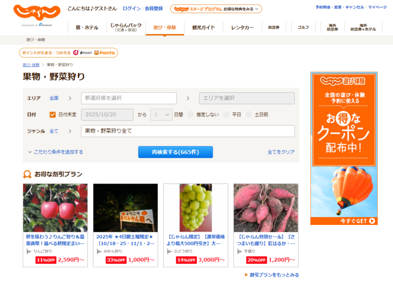 商品名 | じゃらん 遊び・体験予約 | 商品カテゴリ | 旅行 |